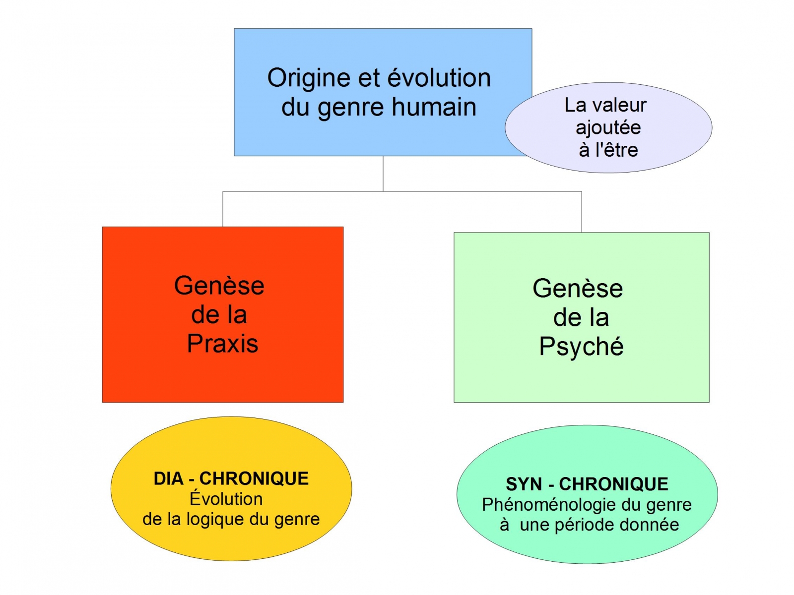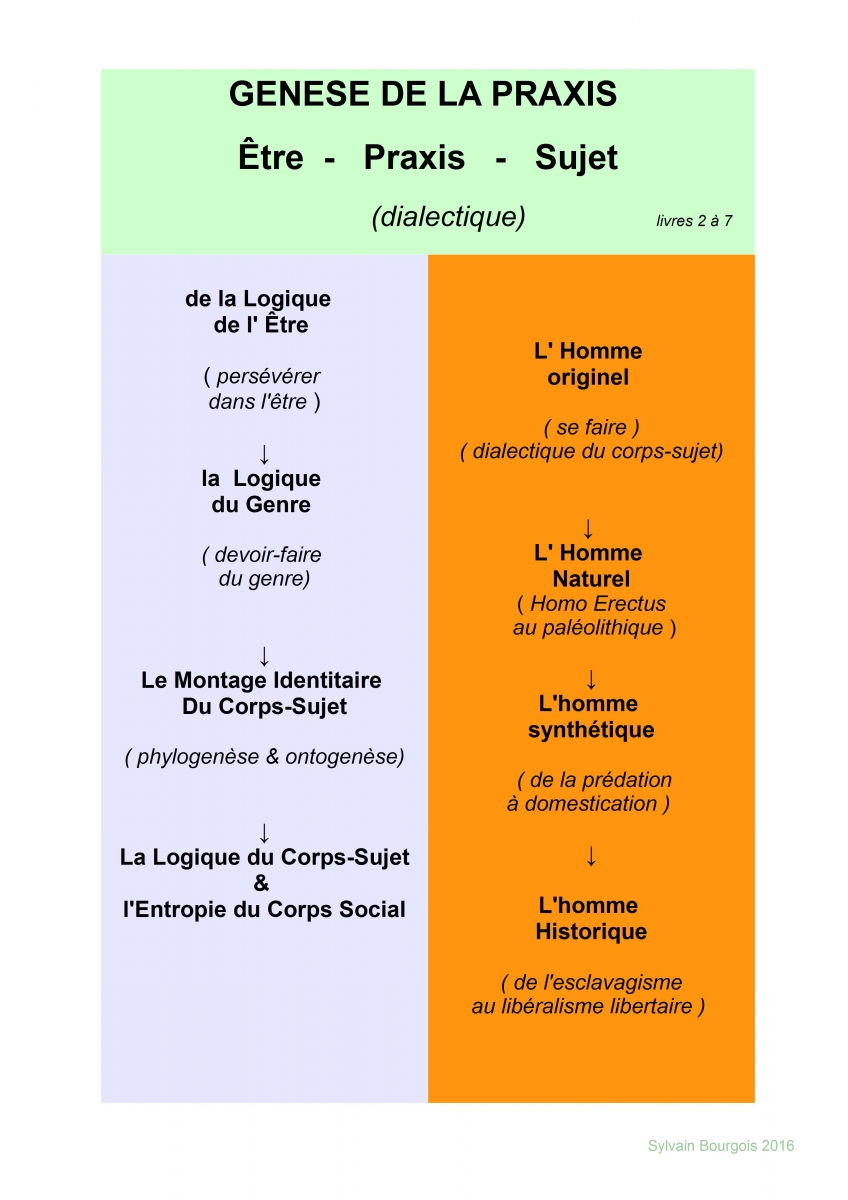 Genèse de la Praxis, livre 1 à 7. : dialectique entre l’être, la praxis et le sujet pour le genre, pour la phylogenèse, selon un axe diachronique et un référentiel ethnocentrique pour les populations. Cela aboutit aux conclusions du livre 7.