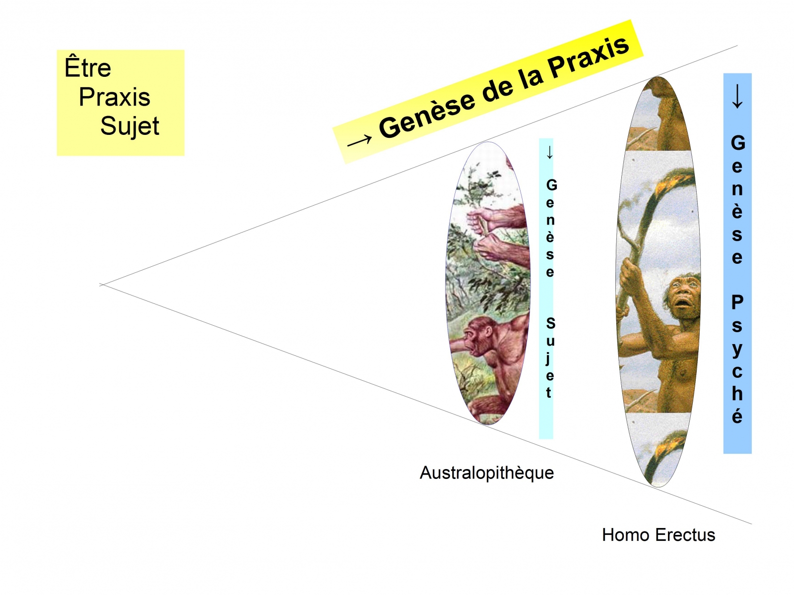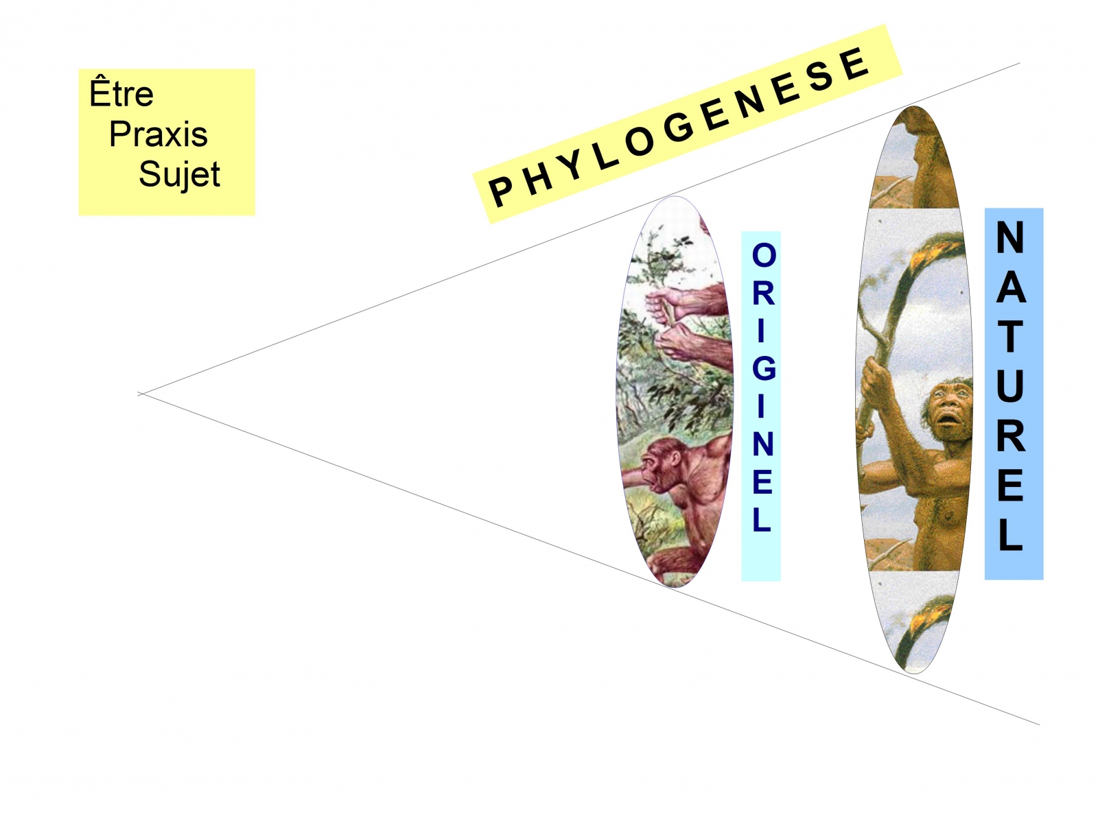 Ce modèle théorique permet d’articuler la dialectique de l’être, la praxis, le sujet dans la longue durée de l’évoutionnisme : passage de la logique du genre à la phénoménologie du genre. C’est la phylogenèse : l’axe diachronique permet de penser la passage de l’homme originel à l’homme naturel.